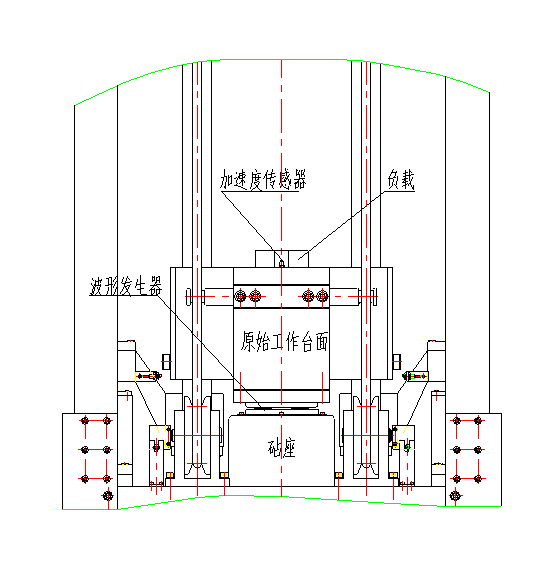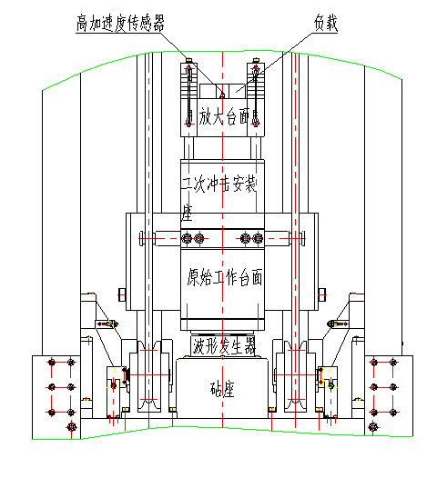 同理,設備工作時,提升機構將原始工作臺面以及固定在原是工作臺面上的二次沖擊裝置沿導向軸提升到一定高度后,臺面等就具有一定的重力勢能,同時由于彈力繩也被拉伸而具有彈性能。當臺面等到達指定的位置后,抱閘鎖緊機構工作,將臺面牢牢的鎖死在導向軸上,提升機構下落,當提升機構到達初始的最低位置后,檢測開關發出指令,控制器得到指令后就讓計算機控制界面的跌落按鈕變亮,在點擊跌落命令后,鎖緊機構打開,靜止的原始臺面以及二次沖擊裝置在重力勢能和彈力繩彈性能的作用下加速向下運動,當運動的原始臺面撞擊到臺體砧座上安放的黑厚波形發生器后,黑后波形發生器就會瞬間變形作用,將原始工作臺面向上反彈,在不考慮能量損失的情況下,就可認為原始工作臺面向上反彈的最大速度大小和原始臺面撞擊波形發生器前的速度大小是一樣的,只不過方向相反。此時,二次沖擊裝置上的工作臺面以及試驗產品是通過拉簧懸掛起來的,在原始臺面運動到與波形發生器相撞前的瞬間,它也會獲得跟原始臺面一樣的運動速度,具有自己的動能,在原始臺面與波形發生器相撞反彈時,二次沖擊裝置上的臺面和試驗產品會克服拉簧的彈性能繼續向下運動,跟反彈的原始臺面和二次沖擊裝置的固定座上面的窄短脈沖發生器相撞,就會產生一個沖擊脈沖,由于兩者是相向撞擊,撞擊烈度更大。測量系統撲捉并顯示這一沖擊脈沖的波形、脈沖峰值加速度、脈沖的持續時間等參數,我們就從顯示的數據上知道了這次二次沖擊裝置上臺面以及試驗產品沖擊時獲得的脈沖峰值加速度、脈沖持續時間、脈沖波形的失真情況。同理,原始臺面在沖擊后會沿導向軸向上反彈,為防止工作臺面二次和波形發生器撞擊,產生二次碰撞沖擊脈沖,鎖緊機構會在工作臺面反彈后鎖緊臺面在某一高度。二次撞擊裝置中的工作臺面以及試驗產品也會由于撞擊而發生反彈,但是,由于拉簧的作用以及二次撞擊裝置中阻尼緩沖墊的作用,臺面和試驗產品雖然會有一定的震蕩,但是基本上不會和窄短脈沖發生器再次撞擊,其震蕩烈度和撞擊烈度不可同日而語,因此,雖然沖擊脈沖波形后沿略有畸變,但是滿足標準要求不成問題。原始臺面和波形發生器撞擊瞬間產生的沖擊能量將由臺體底部安裝的空氣彈簧以及阻尼器來運動吸收,有效降低沖擊能量對周圍環境的影響。改變工作原始臺面的提升高度,就可改變沖擊脈沖峰值加速度的大小。適當的調整一下二次沖擊裝置上的窄短脈沖發生器的厚度,就會使放大臺面上產生的脈沖持續時間更符合要求。