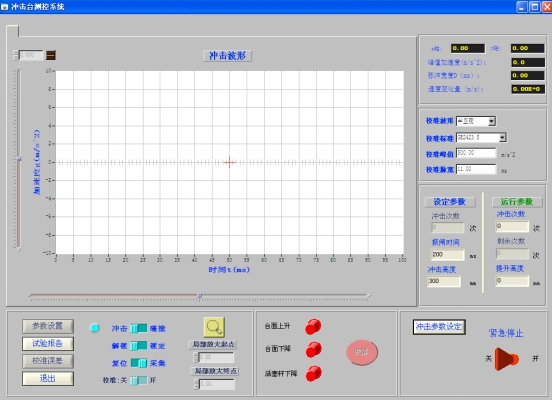 設備工作時,是由提升機構將工作臺面沿導向軸提升到一定高度后,臺面就具有一定的重力勢能,同時該設備還配有四根高強度的彈力繩,當臺面提升時,彈力繩也被拉伸具有彈性能。當臺面到達指定的位置后,抱閘鎖緊機構工作,將臺面牢牢的鎖死在導向軸上,提升機構下落,當提升機構到達初始的最低位置后,檢測開關發出指令,控制器得到指令后就讓計算機控制界面的跌落按鈕變亮,在點擊跌落命令后,鎖緊機構打開,靜止的臺面在重力勢能和彈力繩彈性能的作用下加速向下運動,當運動的臺面撞擊到臺體砧座上安放的波形發生器后,就會產生一個沖擊脈沖,測量系統撲捉并顯示這一沖擊脈沖的波形、脈沖峰值加速度、脈沖的持續時間等參數,我們就從顯示的數據上知道了這次臺面沖擊時獲得的脈沖峰值加速度、脈沖持續時間、脈沖波形的失真情況。臺面在沖擊后會沿導向軸向上反彈,為防止工作臺面二次和波形發生器撞擊,產生二次碰撞沖擊脈沖,鎖緊機構會在工作臺面反彈后鎖緊臺面在某一高度。臺面和波形發生器撞擊瞬間產生的沖擊能量將由臺體底部安裝的空氣彈簧以及阻尼器來運動吸收,有效降低沖擊能量對周圍環境的影響。調整波形發生器的硬度、厚度就可改變沖擊脈沖波形的持續時間,改變工作臺面的提升高度,就可改變沖擊脈沖峰值加速度的大小。