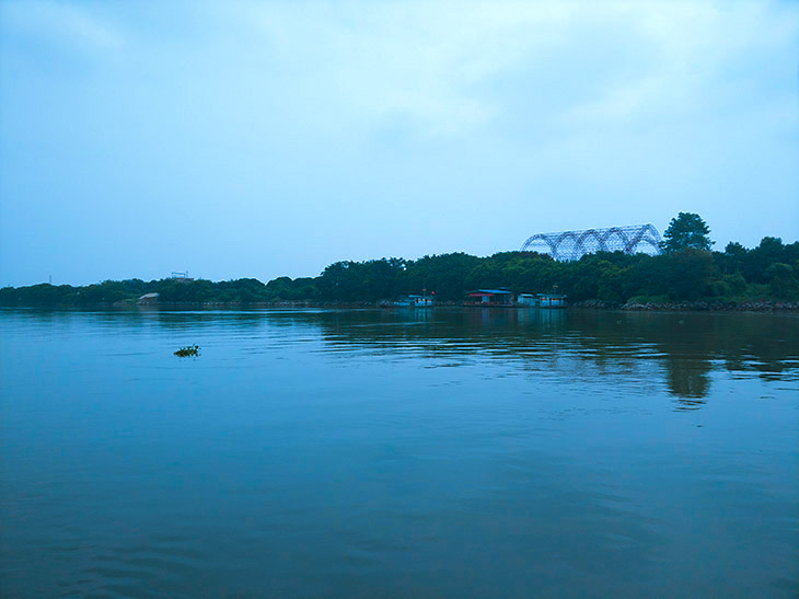 下到渡口,大王洲盎然的綠意隔江在望。雖已立冬,徐來的江風依然熏暖如春。一艘渡輪在江兩岸來回行駛,擺渡過江的人。只見渡輪先從渡口向江心斜行,越過江心之后,船尾開始發力,以船頭為支點,劃了個半圓。原來它要做個漂移。憑著舵手嫻熟的技術,時機得當的把握,渡輪不偏不倚地停靠在渡口邊上。讓初來乍到的我們領略到了這次活動給我們的番驚喜。