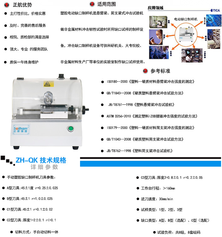 | 產品特點:該產品操作簡單、使用方便,是懸臂梁、簡支梁式沖擊試驗機做非金屬材料沖擊韌性試驗時所用缺口試樣的制樣設備,可供科研機關、大專院校、非金屬材料生產廠等單位的實驗室制作缺口試樣使用。 | |